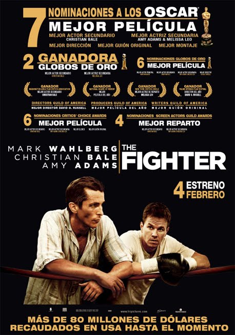 Película: The fighter. Dirección:David O. Russell. País:USA. Año: 2010. Duración: 115 min. Género:Drama. Interpretación:Mark Wahlberg (Micky Ward), Christian Bale (Dicky Eklund), Amy Adams (Charlene Fleming), Melissa Leo (Alice Ward), Jack McGee (George Ward). Guion: Scott Silver, Paul Tamasy y Eric Johnson; basado en un argumento de Keith Dorrington, Paul Tamasy y Eric Johnson. Producción: David Hoberman, Todd Lieberman, Ryan Kavanaugh, Mark Wahlberg, Dorothy Aufiero y Paul Tamasy. Música: Michael Brook. Fotografía: Hoyte Van Hoytema. Montaje: Pamela Martin. Diseño de producción: Judy Becker. Vestuario: Mark Bridges. Distribuidora:TriPictures. Estreno en USA: 17 Diciembre 2010. Estreno en España:4 Febrero 2011.